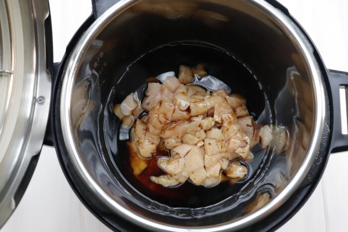 Pour 1/2 cup of water into Instant Pot. Place diced chicken in the pot
